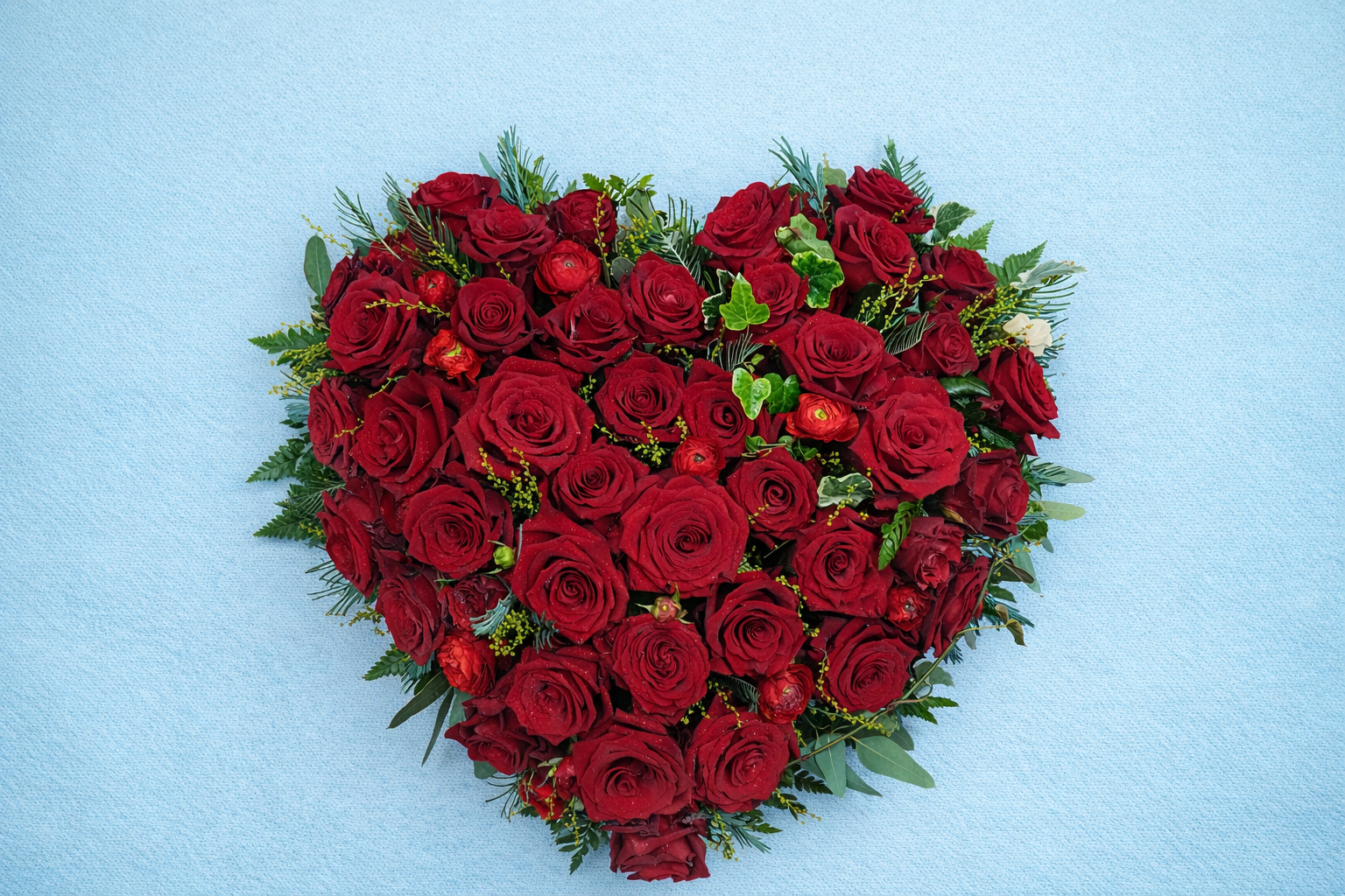 Cœur funéraire composé de roses rouges, sublimé par un feuillage délicat et quelques touches de fleurs légères pour apporter relief et élégance.